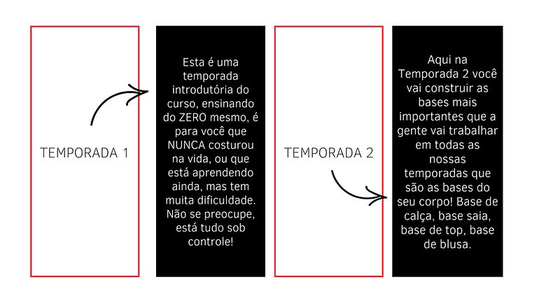 - Temporada 2 – Comecei: Foco em modelagem e confecção de peças básicas como saias e bustos, com introdução a técnicas de ajuste.